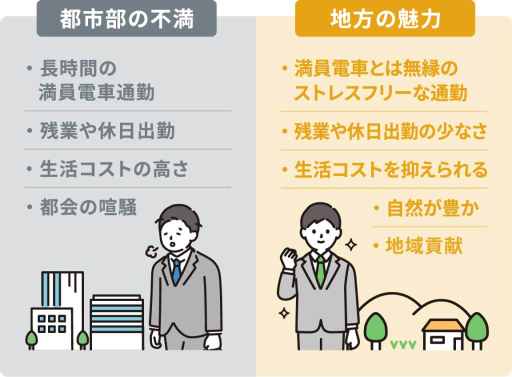 都市部では、高収入と引き換えに長時間労働の常態化や、通勤時間が長いという不満が見受けられます。これを逆手にとって、地方企業ではワークライフバランスの取れた働き方をアピールすることが有効です。現代の働き手は必ずしも高収入だけを求めているわけではなく、自分の時間を大切にする働き方や生き方を重視する人も増えています。