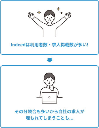 Indeedは利用者が多いため、自社に合った人材が利用している可能性は高いものの、その分、他社の求人に埋もれてしまうリスクもあります。状況に応じた使い分けが大切ですので、どちらを選ぶべきか迷った際はぜひ一度ご相談ください。