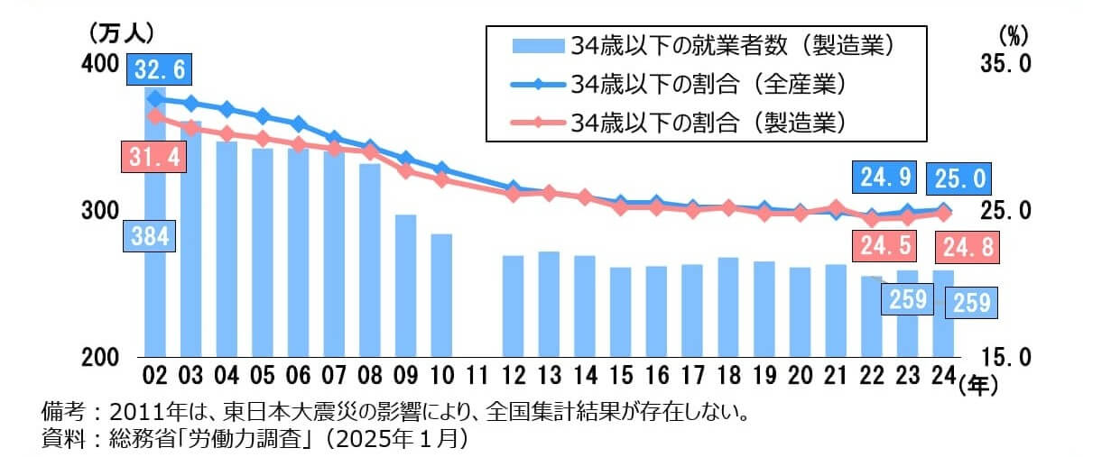 経済産業省の「2025年版ものづくり白書」によると、2002年から2024年にかけて、製造業における34歳以下の就業者数は125万人減少し、全体に占める割合も31.4%から24.8%へと6.6ポイント低下しています。