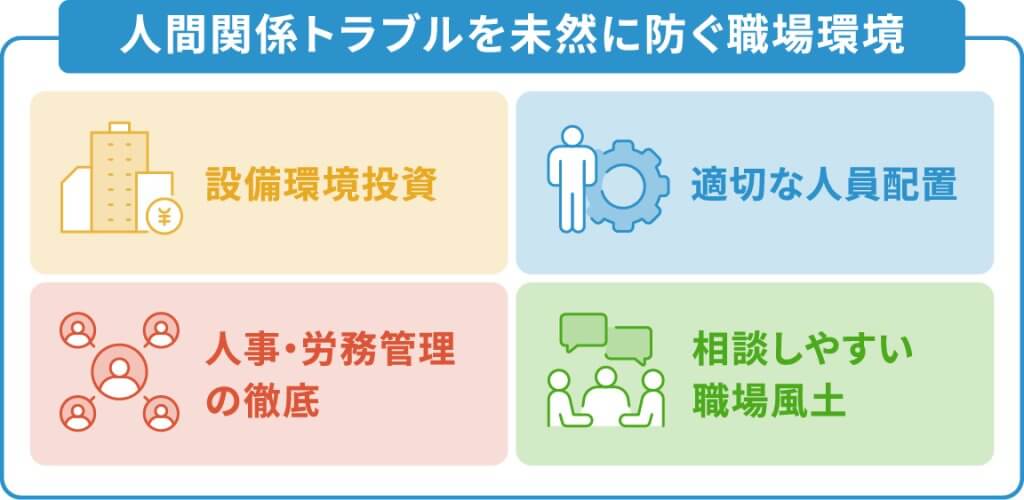 ただし、人間関係に起因するトラブルは、業種を問わずどの職場でも起こりうる問題です。重要なのは、それを未然に防ぎやすい職場環境を整えておくことです。