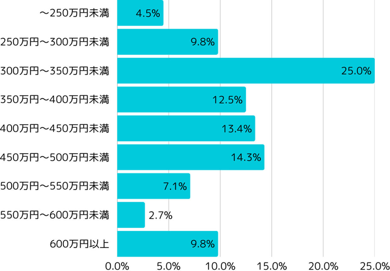 一方で、フォスターが行った調査によれば、製造業に従事する20代の希望年収は「300万円~350万円」が最も多く、全体の25%を占めています。さらに、「300万円~500万円」の範囲に希望年収が集中しており、全体の約65%にのぼります。これは、若年層の多くが給与に対して現実的な期待を持っていることを示しています。